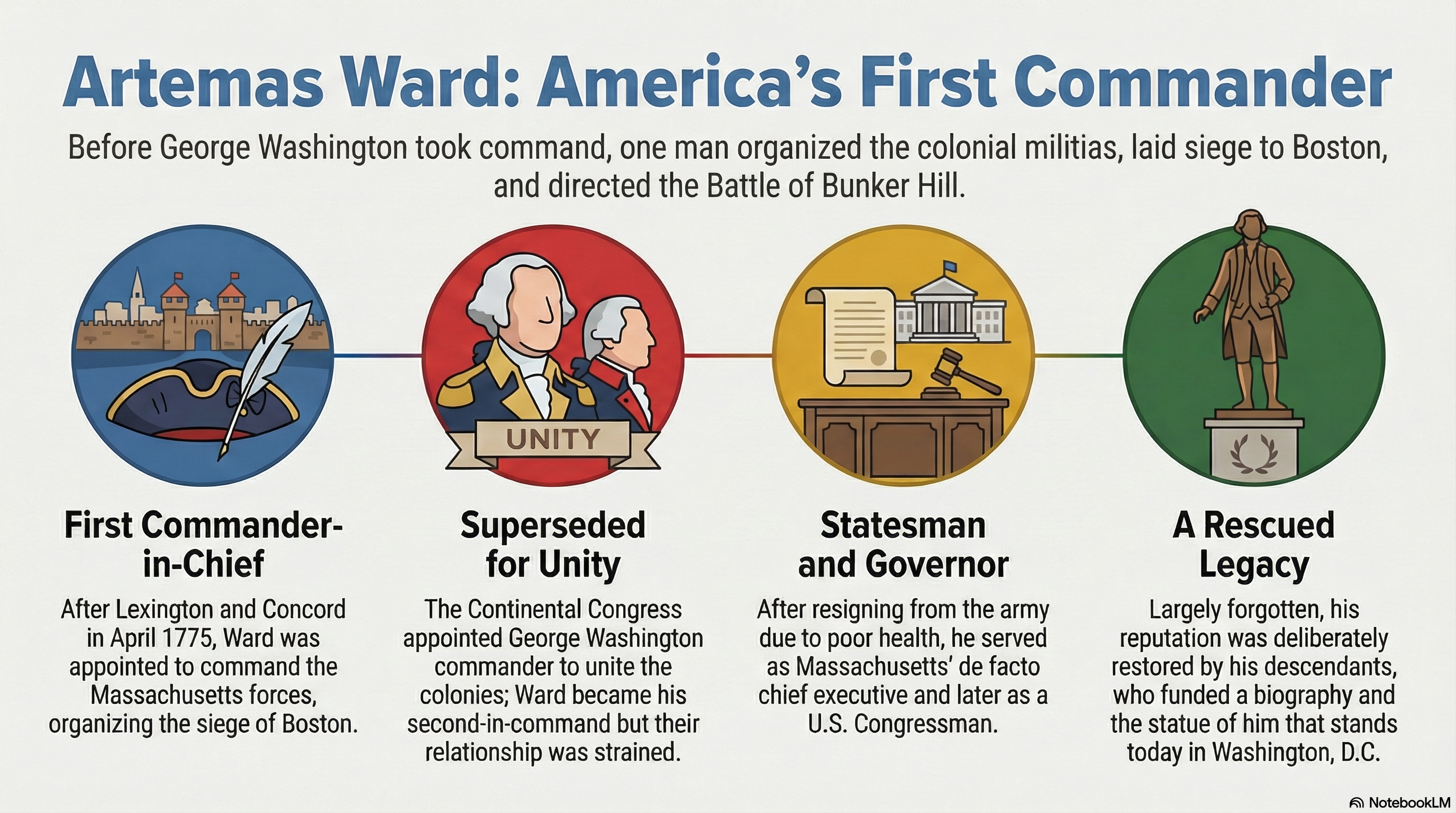 Artemas Ward is one of those figures who sits quietly at the edge of the American Revolution, the way a man might stand just outside the light of a campfire. People know Washington. Some know Knox. A few know Putnam. Ward, if remembered at all, is too often mistaken for a vaudeville comedian who came along a century later. It is the sort of historical injustice that makes you shake your head. Here was the man who commanded the provincial army that surrounded Boston before Washington ever arrived. Here was the man the Continental Congress came close to elevating as the first official Commander in Chief. John Adams admired him so deeply that he called Ward universally esteemed, beloved and confided in by his army and his country. Yet to this day historians bury him in a footnote. Ward did not chase glory. He quietly held the line and built the army Washington needed, then watched other men take the bows. History likes its heroes bold and brash. It rarely holds the same affection for the organizers and caretakers of a fragile cause. Ward built the scaffolding that kept the Revolution from collapsing before it even started.