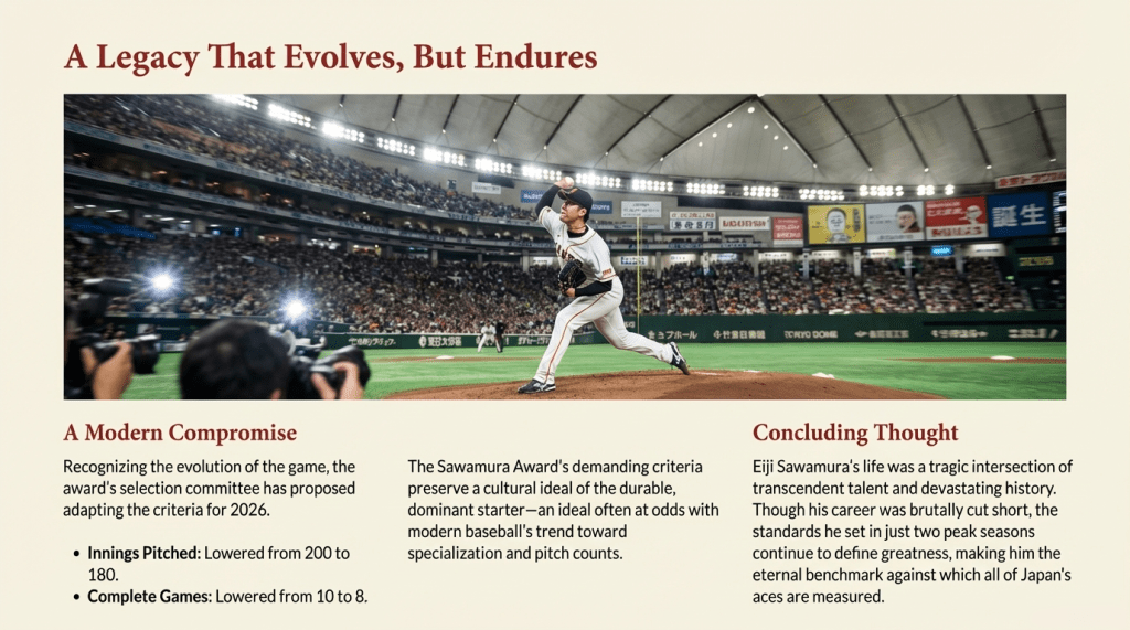His life is remembered in the Sawamura Award, a Japanese mirror to the Cy Young Award, handed out each year to the best pitcher in Nippon Professional Baseball. That trophy sits in the background of modern baseball in Japan like a ghostly reminder. It is the universe whispering that brilliance does not always get a happy ending. It does not even always get a full story. Sometimes brilliance is a spark in a cold wind, and the fact that it ever glowed at all is what we remember.