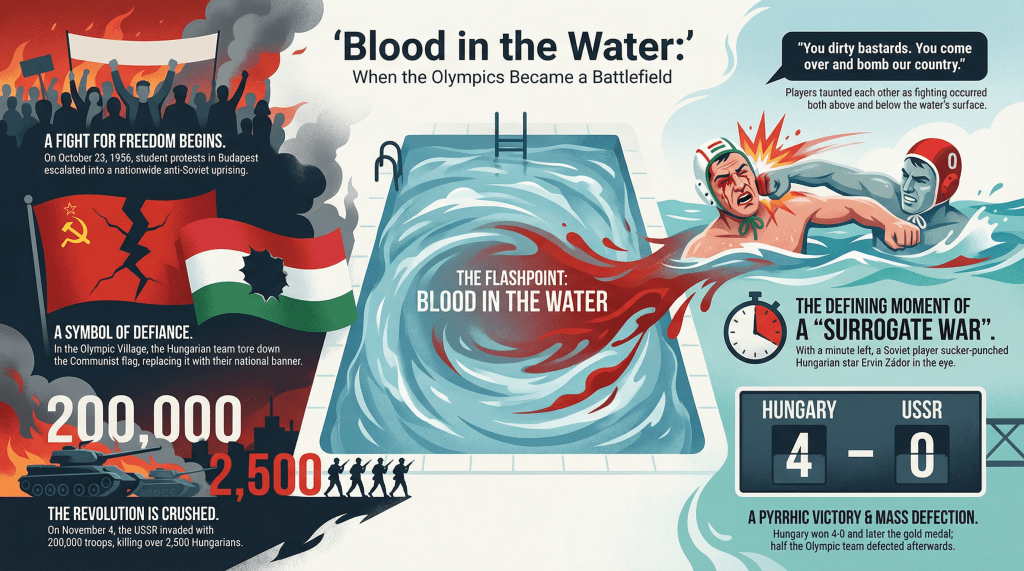 There are moments in history when a single image carries the weight of an entire generation’s grief. Not the kind of image museums print on postcards, but the kind that sticks somewhere behind the eyes. In December of 1956, during the Melbourne Olympic Games, a photographer caught Hungarian water polo player Ervin Zador climbing out of the pool with blood streaming down his face from a crescent shaped cut over his right eye. He looked stunned, angry, and heartbreakingly young. The photograph flashed across the globe, and for a brief moment the world understood that the pool in Melbourne had become another battlefield in a much larger and darker struggle. The match between Hungary and the Soviet Union was supposed to be a semifinal for a gold medal. Instead, it became the kind of surrogate war humans seem to stage whenever they are trying very hard not to stumble into a real one.