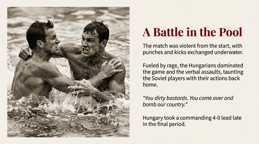 On December 5, 1956, more than five thousand spectators filled the natatorium. Most were Hungarian expatriates who had fled years earlier or had come from as far away as Australia’s small Hungarian community could travel. Their shouts filled the air before the first whistle. The Hungarian captain refused to shake hands with the Soviet captain. The crowd roared approval. The Soviets stood quietly. They had heard the insults and understood the emotion, but they were there to play a game that had suddenly become a theater of national defiance.