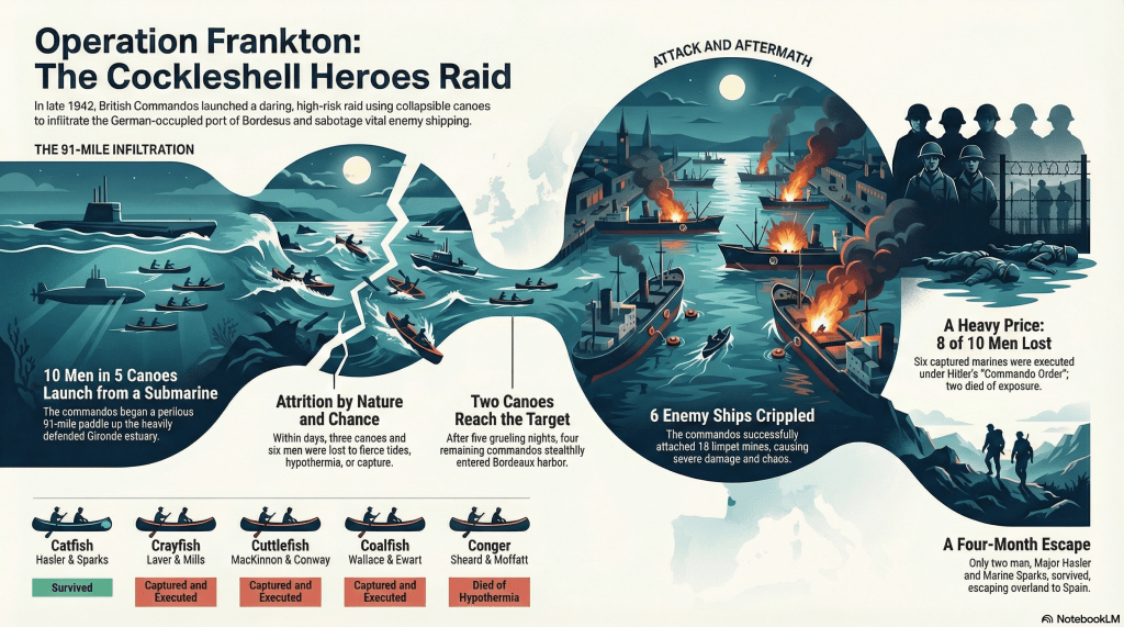 There are stories from the Second World War that seem to have been written by a nervous committee of novelists who could not quite decide whether to craft an adventure, a tragedy, or a comedy of bureaucratic errors. Operation Frankton tends to sit in that uneasy place, a tale of quiet courage and outrageous improvisation that begins with a group of Royal Marines paddling collapsible canoes into the heart of German controlled France and ends with the bitter realization that heroism does not always compensate for human folly in high places. It is also a story that generations of schoolboys once whispered with a kind of reverence, mostly because no one could believe that grown men had willingly set off to fight the Third Reich armed with nothing more than paddles, limpet mines, and a determination that bordered on the poetic. The nickname did not hurt either. The Cockleshell Heroes. A name that sounded whimsical enough to disarm the truth, which was far harsher and more impressive than any screenplay Hollywood ever attempted to bolt together.