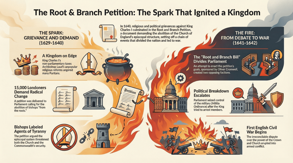 The Root and Branch Petition arrived at the Long Parliament in December of 1640, and it landed with the weight of fifteen thousand signatures. In an age before online petitions and digital pressure campaigns, that number said something powerful. It said that London had reached its boiling point. It said that grievances that had been simmering for more than a decade had reached the surface. It said that King Charles I and his archbishop, William Laud, had pushed the kingdom into a corner. And it said, most of all, that the constitutional and religious crises of England were no longer separate storms. They had become one weather system, rolling in from every direction.