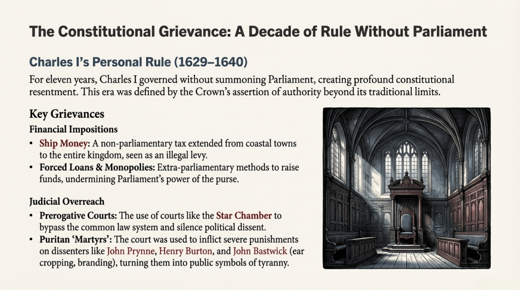To understand why fifteen thousand Londoners were ready to swing an axe at the episcopal tree, one must step back into the uneasy decade that preceded the petition. Between 1629 and 1640, England lived under what Charles I called his Personal Rule and what his critics called something far less flattering. The King dissolved Parliament in 1629 and governed without it for eleven long years. During this period he discovered new ways to raise money without the troublesome business of summoning representatives. Ship Money, a medieval tax once limited to coastal emergencies, became an annual nationwide levy. Prerogative courts like the Star Chamber and High Commission became tools for enforcing royal policy. The machinery of government shifted from a cooperative constitutional framework toward a royal system that convinced many Englishmen that an absolute monarchy was quietly sliding into place.