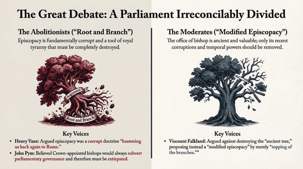 The wording was unambiguous. The petition called for the abolition of archbishops, bishops, deans, chapters, prebends, canons, and every ecclesiastical office that sprouted from the same root. It was a request for a religious system grounded not in the inherited structures of English custom but in something the petitioners described as government according to Gods Word. Most Parliament men knew what that implied. It was a quiet but unmistakable nod toward the Presbyterian model of Scotland, the same model Charles had tried and failed to impose upon the Scots only a short time earlier.