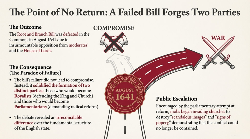 The Root and Branch Bill did not survive these storms. By August 1641, opposition from moderates and fierce resistance in the House of Lords ensured that the bill would die without a final vote. But the debates had changed England in ways no single bill could measure. The discussions split Parliament into two groups that would soon give themselves memorable nicknames. Royalists began calling themselves Cavaliers. Parliament supporters, many of them London apprentices, embraced the term Roundheads. The labels stuck because they captured something real. The argument over bishops had forced clarity on both sides. The old political alliances were gone. New identities had emerged. Everyone in England could sense that the country had stepped through a doorway and found no way back.
