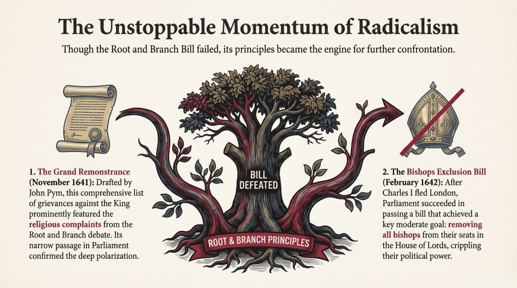 The issues raised by the petition reappeared later in 1641 in the Grand Remonstrance, a long list of grievances drafted by John Pym. The Remonstrance insisted that political and religious abuses were inseparable. This document narrowly passed in the Commons and provoked an uproar. Moderate members believed Pym had pushed too far. They accused him of dividing the nation at the very moment unity was needed. But for Pym and his allies, the division already existed and had been exposed by the debate over bishops. The votes simply acknowledged reality. England was no longer a kingdom with shared assumptions. It had become a kingdom at odds with itself.