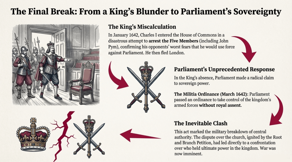 Events accelerated. In early 1642 Parliament passed the Bishops Exclusion Bill, removing bishops from the House of Lords. The King tried to arrest five members of Parliament, among them Pym, which turned London against him. Charles fled the city. Parliament claimed control of the militia without the royal assent. Constitutional order faltered, then shattered. What had begun as a debate over ecclesiastical structure had become a fight over sovereignty. The petitioners of December 1640 may not have imagined civil war, but they helped tug the thread that unraveled the garment.