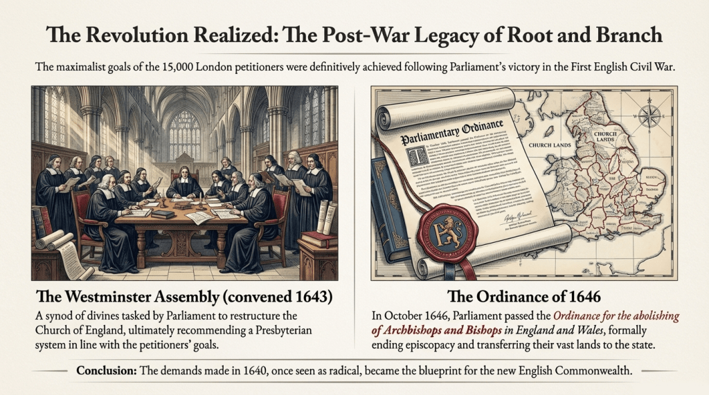 When that war finally erupted in August 1642, both sides carried the memory of the petition with them. The Parliamentarian cause now included an explicit religious aim. The episcopal system that had divided the kingdom was part of the conflict’s foundation. When Parliament convened the Westminster Assembly in 1643, it did so with the intention of building a new Church of England grounded in non episcopal governance. The Scots, who had entered an alliance with Parliament, encouraged a Presbyterian structure. Parliament moved slowly but steadily in that direction. In 1646, after the Royalist armies had collapsed, Parliament passed the Ordinance for the abolishing of Archbishops and Bishops in England and Wales. It confiscated episcopal lands for the Commonwealth. The petitioners had demanded the tree be uprooted. Parliament finally obliged.
