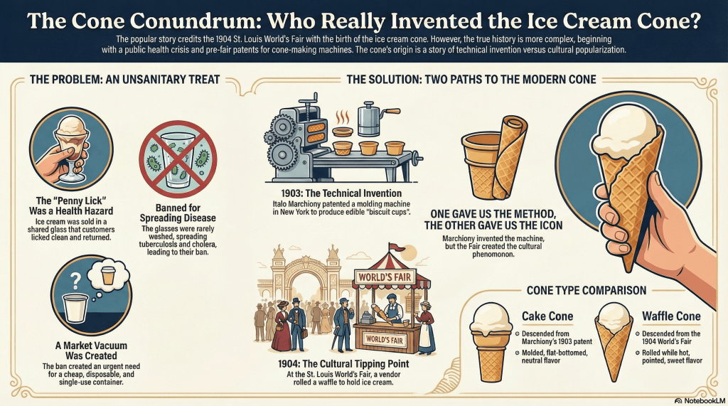 To understand why the cone mattered, you have to start in the unglamorous world of late nineteenth century street food, where ice cream was sold in ways that would make a modern health inspector faint and reach for a pen. In London and other cities, the penny lick was common. It was a thick glass with a shallow depression at the top. The thickness of the glass made the serving look larger than it was, which was its own quiet scam, but the real issue was what happened next. A customer paid a penny, licked the ice cream clean, handed the glass back, and walked away. The vendor reused it immediately, often without washing. In crowded neighborhoods, the same glass could pass from mouth to mouth all afternoon.