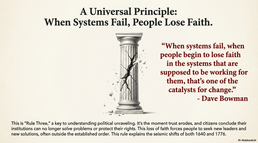 At the center of the discussion is what Dave calls Rule Three. When institutions stop working, people turn to personalities. The Root and Branch Petition is not a riot or a rebellion. It is citizens doing the last thing available to them within the system. They write. They list grievances. They demand structural change, not cosmetic fixes. That habit, Dave reminds us, did not originate with Americans. It was inherited.