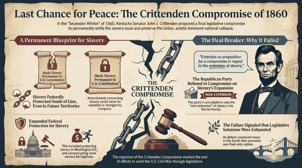 In that sense, the Crittenden Compromise is more than a political failure. It is a farewell to an age when Americans believed that every crisis could be solved with another careful arrangement. It reminds us that a country can reach a moment when its internal contradictions become too large to paper over. It warns that even honest and well meaning proposals cannot rescue a nation that has already decided to become something else.