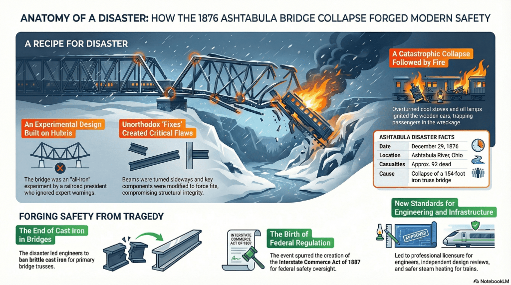 The specific regulatory path from Ashtabula to later federal action is not a single straight line, but the general arc is clear. Public pressure, repeated disasters, and professional advocacy pushed the country toward stronger oversight of railroads, culminating in major federal interventions in the 1880s, including the Interstate Commerce Act. Americans did not wake up one morning and decide to regulate. They were pushed there by wreckage.