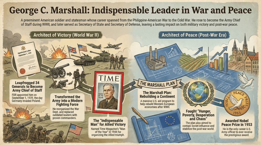 Marshall was never interested in being admired. He was interested in systems that worked, institutions that endured, and decisions that could survive contact with reality. In war, that meant logistics, training, and discipline. In peace, it meant food, currency, and confidence. His reputation as the architect of victory in the Second World War rests not on battlefield command but on the quieter, more difficult task of turning a small, unprepared army into a global force capable of fighting on multiple continents at once. His reputation as an architect of peace rests on something even rarer, the willingness to rebuild former enemies rather than punish them for the satisfaction of the moment.