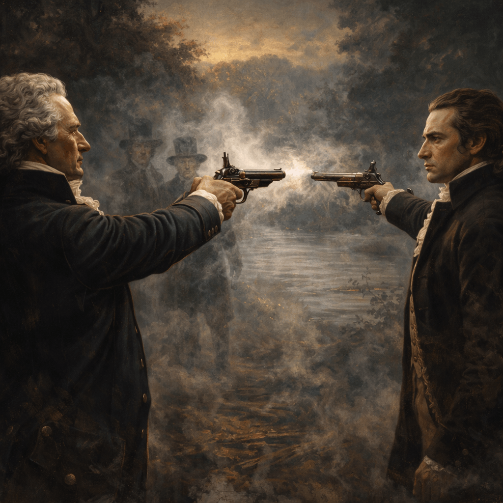 What happened in those seconds has been argued ever since. Accounts differ. What is certain is that Burr fired and struck Hamilton. Hamilton fell, mortally wounded. He was carried back across the river to New York.