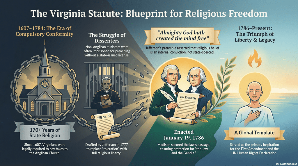 The Virginia Statute for Religious Freedom stands as one of the rare moments in history when law does more than regulate conduct. It redraws the boundaries of thought itself. Long described as an unparalleled achievement in Western political thought, the statute earned that reputation because it accomplished something no legislature had previously managed. It fully dismantled a state sanctioned church and did so not as a temporary expedient or a concession to political pressure, but as a matter of principle. In Virginia, religious establishment was not softened, pluralized, or redistributed. It was ended.
