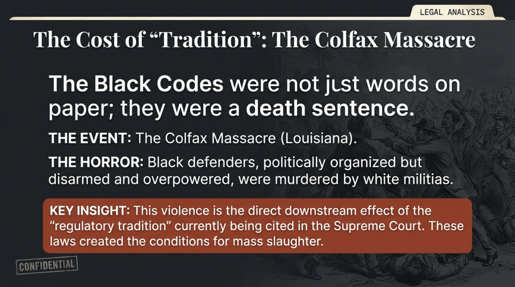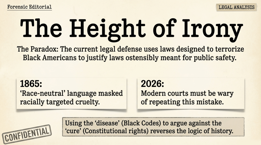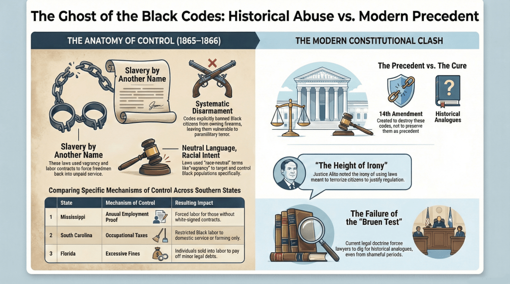 That is why the recent Supreme Court exchange struck such a nerve. Citing the Black Codes as neutral historical examples forced an uncomfortable reckoning. These were not obscure municipal ordinances. They were instruments of racial domination, crafted in bad faith, enforced selectively, and designed to terrorize a population into compliance. Treating them as mere data points risks laundering their intent.