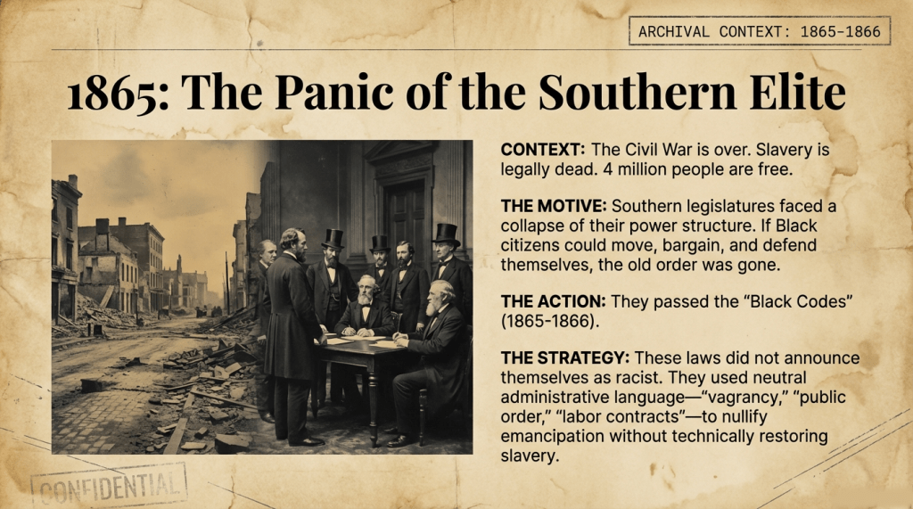 The Black Codes emerged from a moment that felt, to many Americans in 1865, like standing in the aftermath of a storm that had flattened a town but spared the foundations. The Civil War had ended. The guns had cooled. The Union was preserved, at least on paper. Slavery was dead in law, even if its ghost had not yet figured that out. Four million formerly enslaved people stepped into freedom carrying little more than hope, memory, and the knowledge of how fragile both could be. White Southerners stepped into defeat carrying something else, fear, resentment, and an almost theological commitment to the old order.