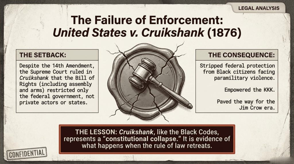 The Supreme Court did not cause this retreat alone, but it codified it. Cruikshank was not an isolated decision. It was part of a broader judicial narrowing of federal authority. The message to Southern states was unmistakable. If discrimination could be framed as private action, federal remedies would fail. If violence could be localized, Washington would look away.