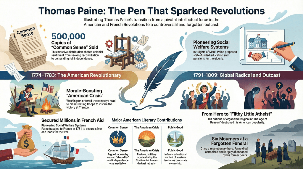 When he returned to the United States in 1802 at the invitation of Thomas Jefferson, he found a colder country than the one he had left. Federalists regarded him as a dangerous radical. Religious communities dismissed him as an atheist. He struggled financially and socially, moving between lodgings, dependent on a shrinking circle of friends. He was mocked in print and ignored in public. The man who had once helped give voice to a nation found himself treated as an embarrassment.