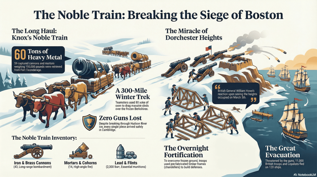 Henry Knox had done the impossible thing quietly. Forty days. Nearly three hundred miles. Fifty-nine pieces of artillery. Sixty tons of iron and brass dragged across mountains and rivers in the worst season New England could offer.