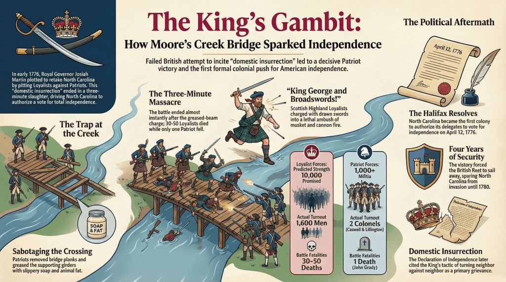 When historians search for the turning points that nudged America toward independence, they often look to grander names: Lexington, Bunker Hill, Saratoga. Moore’s Creek rarely headlines the list. Perhaps that is because its violence was intimate. It was not empire against continent. It was community against community, engineered from above.