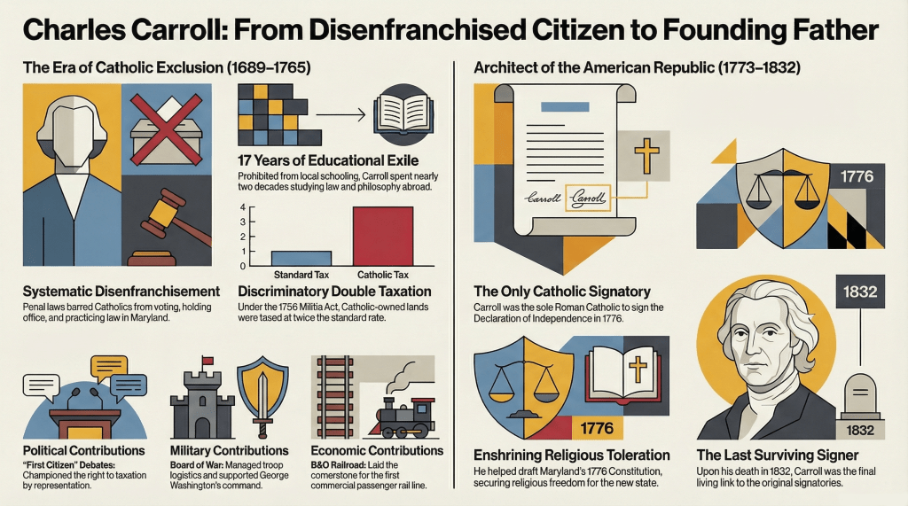 Carroll played a role in shaping that structure. In drafting Maryland’s 1776 constitution, he helped ensure that religious toleration would be embedded in the legal framework of the new state. This was not an abstract principle for him. It was drawn from lived experience. He had seen what it meant to be excluded, and he understood the importance of preventing that exclusion from becoming law again.