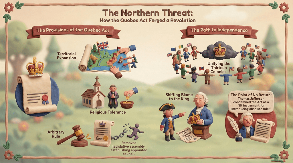 First, it handed vast western lands, territory colonists believed they had fought and bled for, over to Quebec. Second, it established a form of government there with no elected assembly, no juries, and authority resting squarely in the hands of a crown-appointed governor. And third, perhaps most unsettling of all, it restored and protected Roman Catholic institutions in the region, complete with the power to collect tithes.