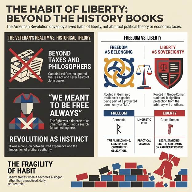 And here is where the modern ear begins to mishear the past. When Preston spoke of being free, he was not describing the loose, unbounded idea that floats through our politics today, the notion that freedom means doing whatever one wishes without restraint. He was speaking out of a world where belonging and obligation were assumed, where the community defined the man, and where the deeper concern was whether that way of life could be altered by distant authority without consent.