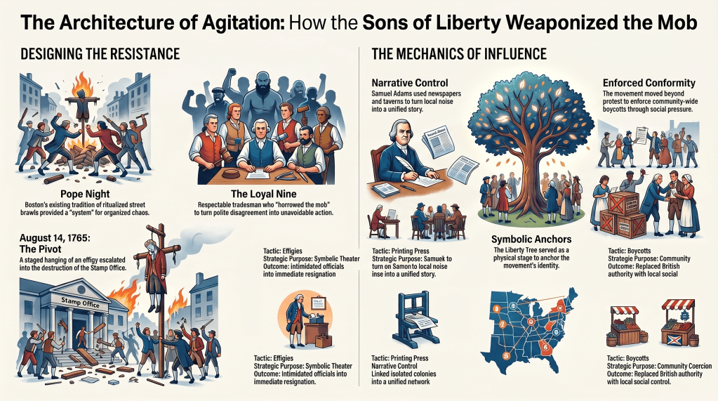 Adams and the Sons of Liberty did not resolve that contradiction. They used it. They operated in the space between those interpretations, presenting themselves as defenders of order while applying pressure in ways that clearly unsettled it. They condemned excess when it threatened to undermine their position, and they encouraged action when it advanced their cause.