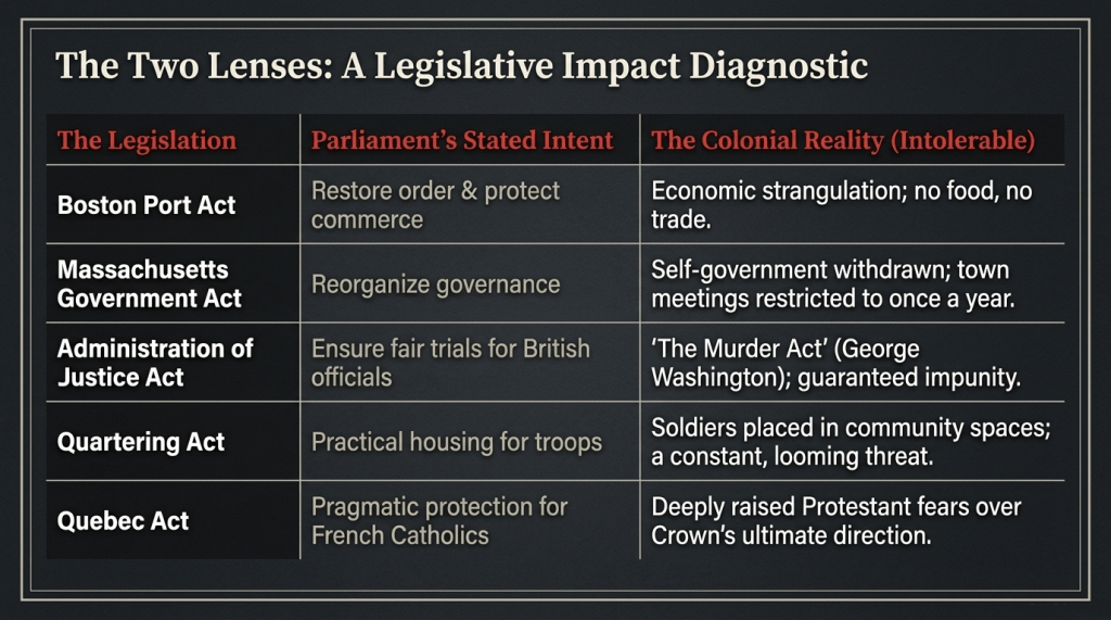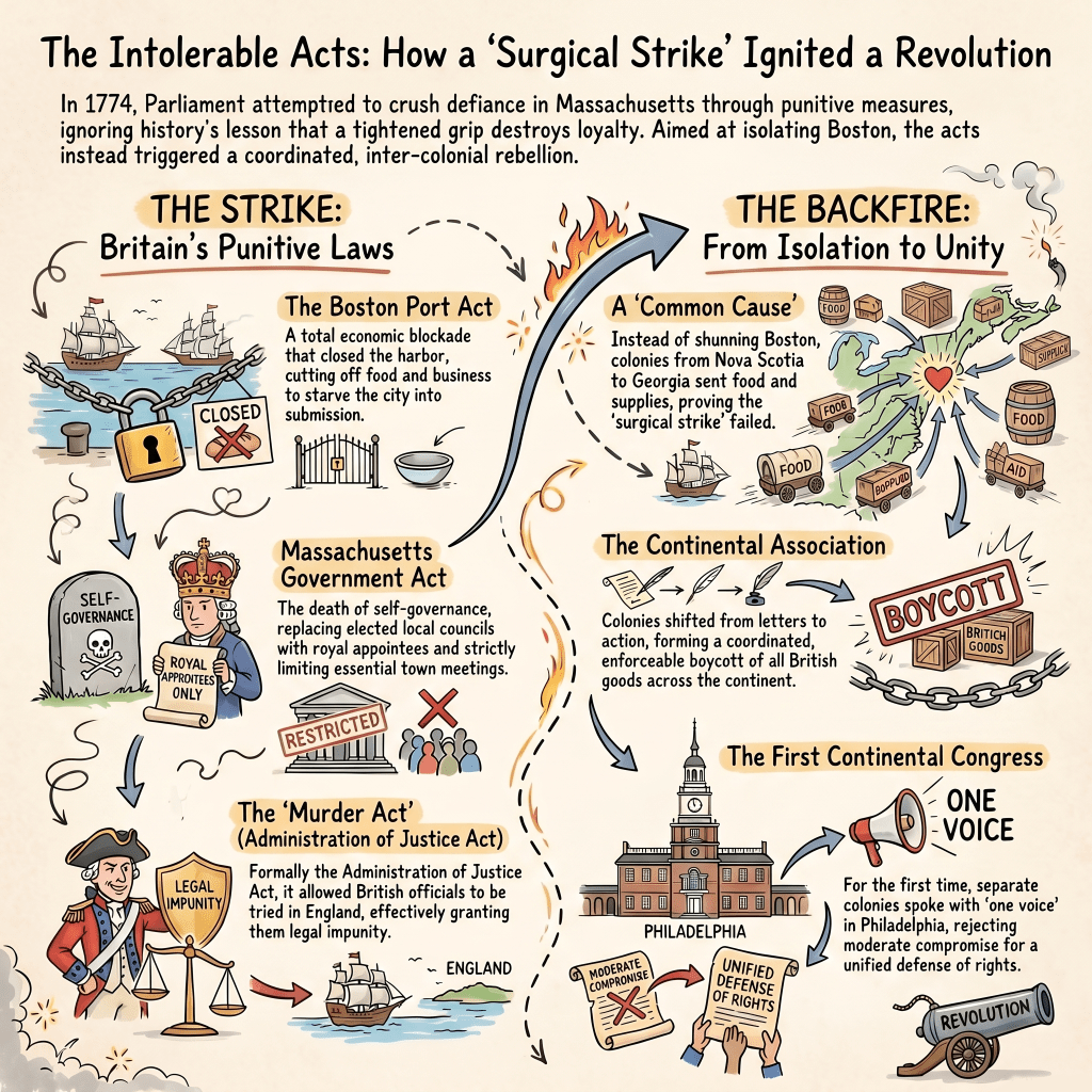 By 1774, Boston had already earned a reputation in London as the problem child of the empire. The Boston Tea Party confirmed every suspicion that British officials had been nursing. Massachusetts, in their view, was not simply unhappy. It was defiant. And defiance, in the logic of empire, demands correction. The result was a series of laws that Parliament called the Coercive Acts, a name that at least had the virtue of honesty. In the colonies, they would be remembered by a different name, one that required no explanation. Intolerable.