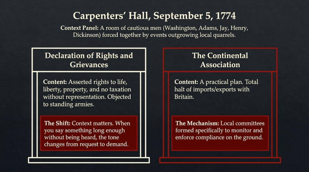 They argued. Of course they argued. About authority, about loyalty, about how far was too far. The language shifted depending on who was speaking. Some spoke of rights as Englishmen, grounded in tradition and law. Others spoke of something broader, less tied to Britain and more tied to the idea that people ought to govern themselves. The difference between those two positions may not sound large, but in 1774 it was the distance between reconciliation and rupture.