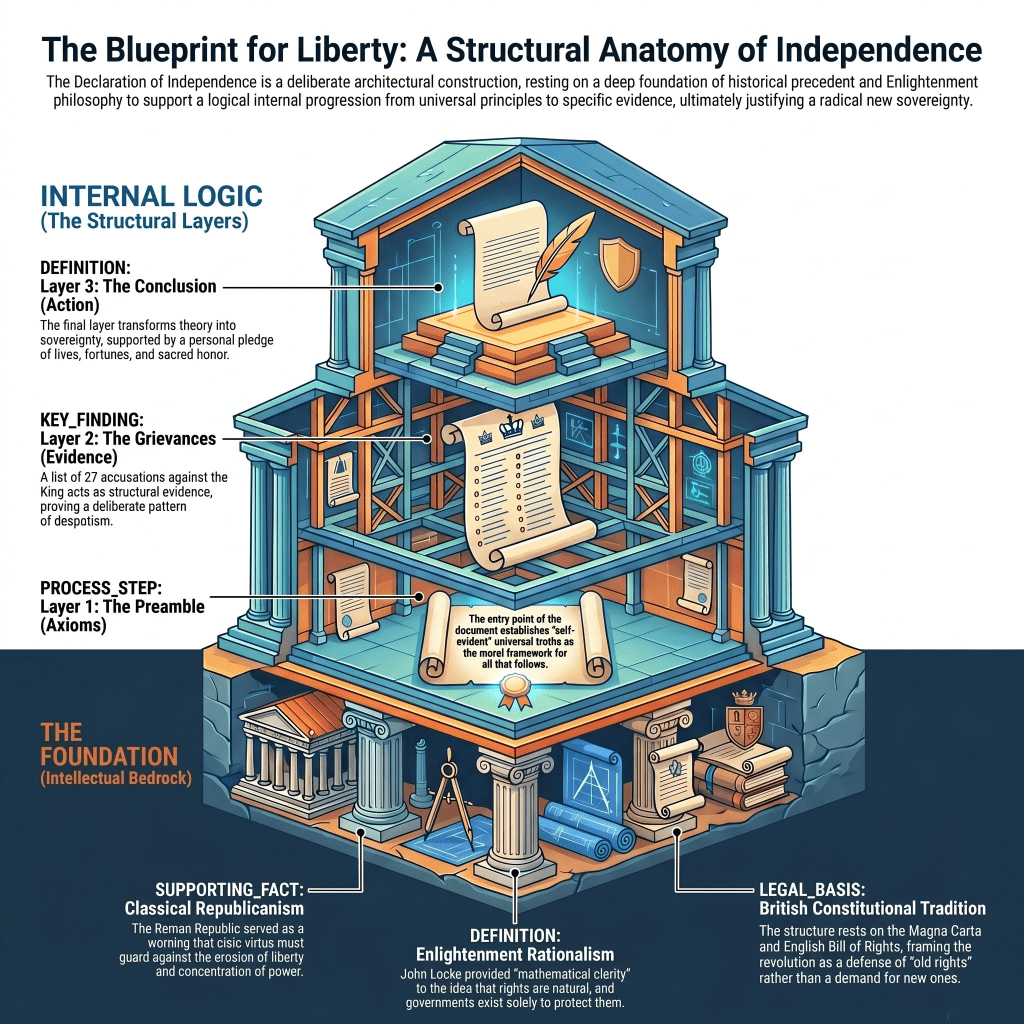It helps, then, to stop reading it like a speech and start walking through it like a building. The men who wrote it were not improvising. They were assembling something meant to stand, something that could bear not just the moment of 1776 but the strain of years that would test whether any of this was more than words.