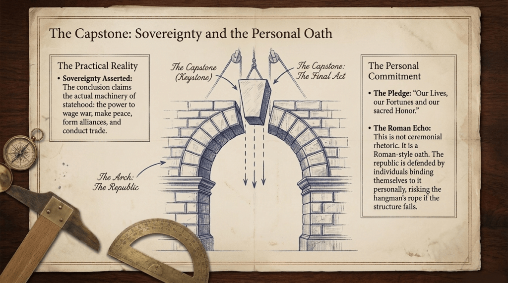 The conclusion is not long, but it carries weight because everything before it has done the work. The colonies are, and of right ought to be, free and independent states. They claim the powers that come with that status, to wage war, to make peace, to form alliances, to conduct trade. These are not symbolic gestures. They are the practical realities of sovereignty, stated plainly.